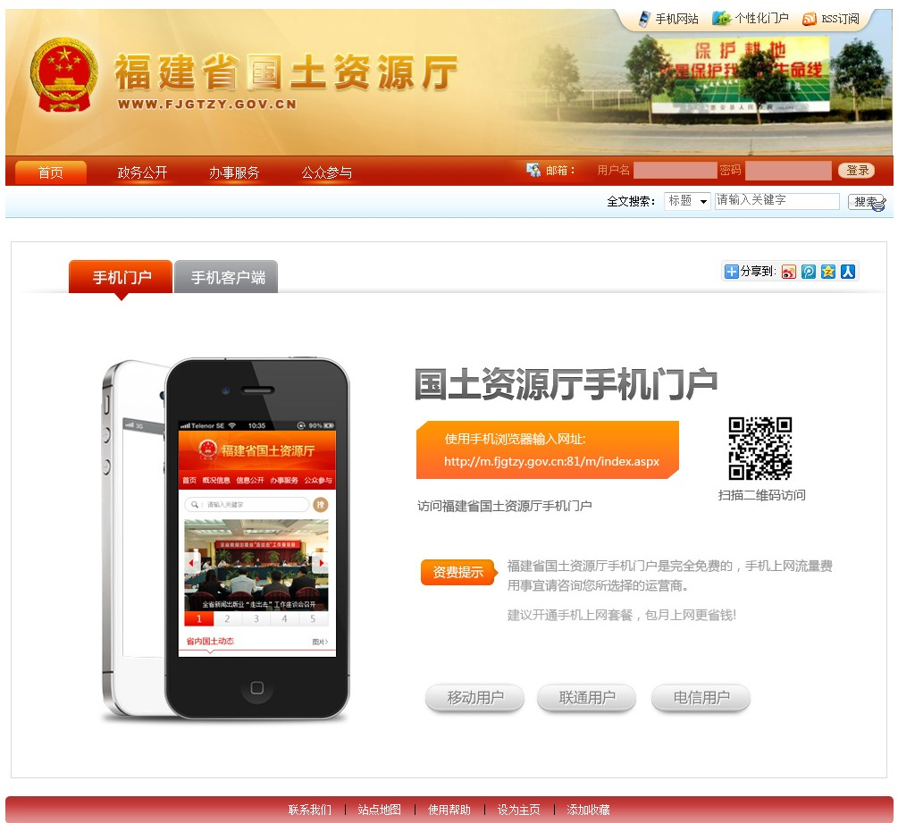 2012年(nián)11月(yuè)26日(rì),福建省國(guó)土(tǔ)資源廳(網址:http://www.fjgtzy.gov.cn)“新技(jì)術(shù)(手機(jī)門(mén)戶、個(gè)性化(huà)門(mén)戶)”建設完成并正式上(shàng)線運行(xíng)。