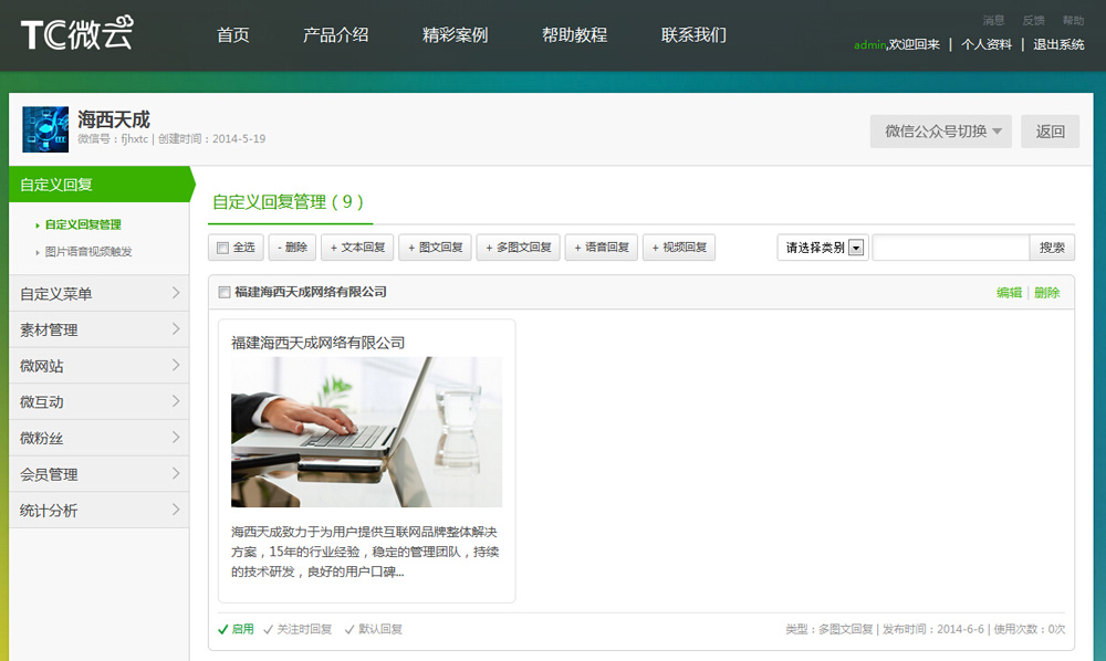 TC微(wēi)雲(天成微(wēi)信營銷管理(lǐ)平台)是(shì)我司自(zì)主研發的(de)微(wēi)信管理(lǐ)平台,平台應用(yòngβ)功能(néng)經我司技(jì)術(shù)團體(tǐ)進行(xíng)多(duō)次升級,目前完全滿足不(bù)同行(xíng)業(yè)客戶的(de)σ需求。