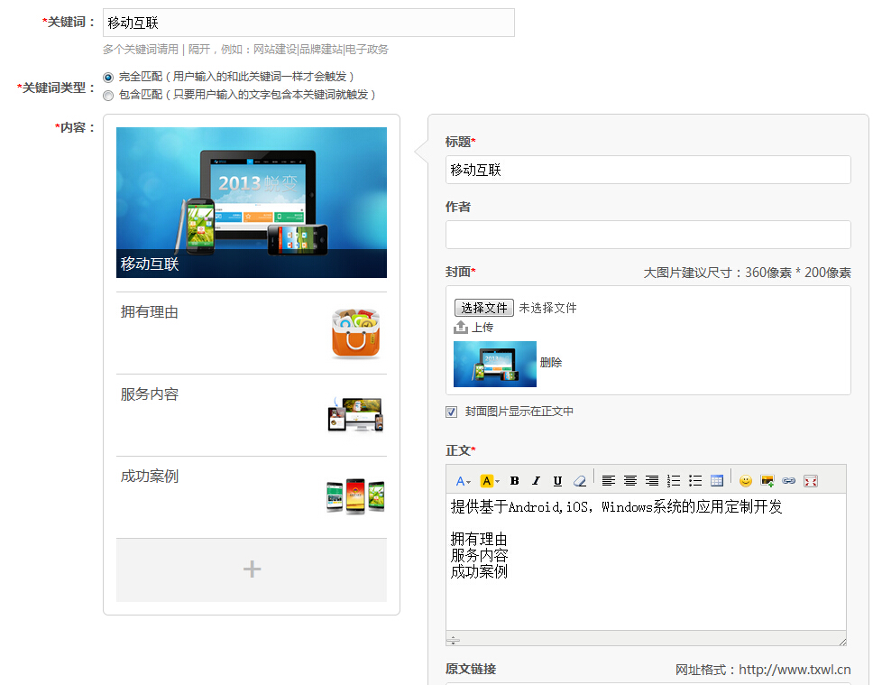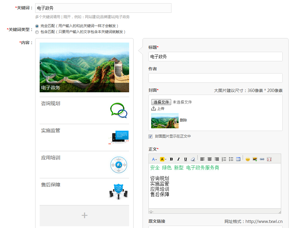 TC微(wēi)雲的(de)特性,“穩定、靈活、易用(yòng)、可(kě)擴展、安全”等優勢,現(xiàn)系統功能(néng)已成功集成到(dγào)“Tcms網站(zhàn)內(nèi)容管理(lǐ)系統”中,用(yòng)戶隻需在門(mén)戶網站(zhàn)後台上(shàn→g)既可(kě)以管理(lǐ)微(wēi)信後台,從(cóng)而大(dà)大(dà)增加了(le)管理(lǐ)的(de)便捷性。