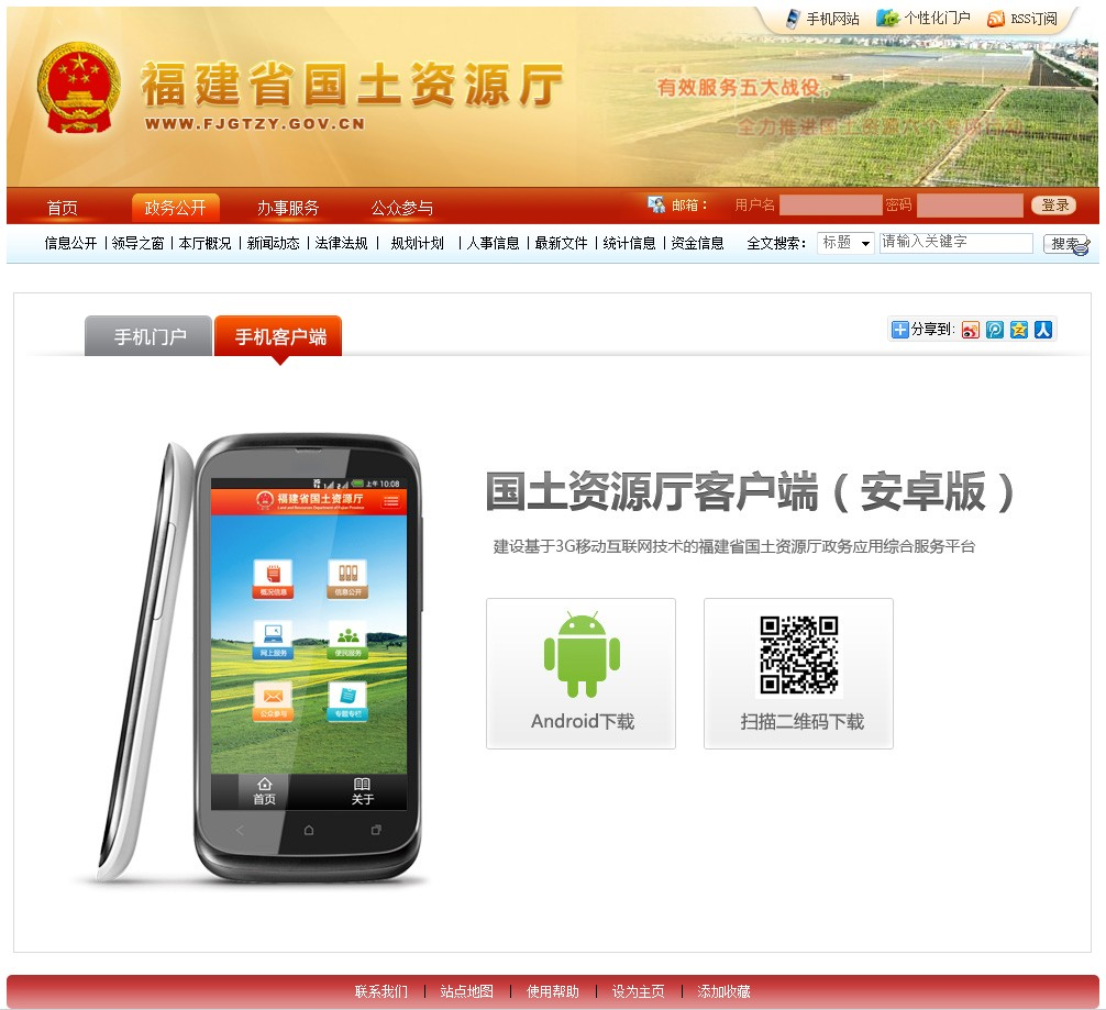 2012年(nián)11月(yuè)26日(rì),福建省國(guó)土(tǔ)資源廳(網址:http://www.fjgtzy.gov.cn)“新技(jì)術(shù)(手機(jī)門(mén)戶、個(gè)性化(huà)門(mén)戶)”建設完成并正式上(shàng)線運行(xíng)。